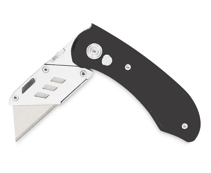 High Quality Compact utility knife safely folds to fit in your pocket w/Clip. This item is Laser Friendly, turns out White on the bllack background. Push-button release.